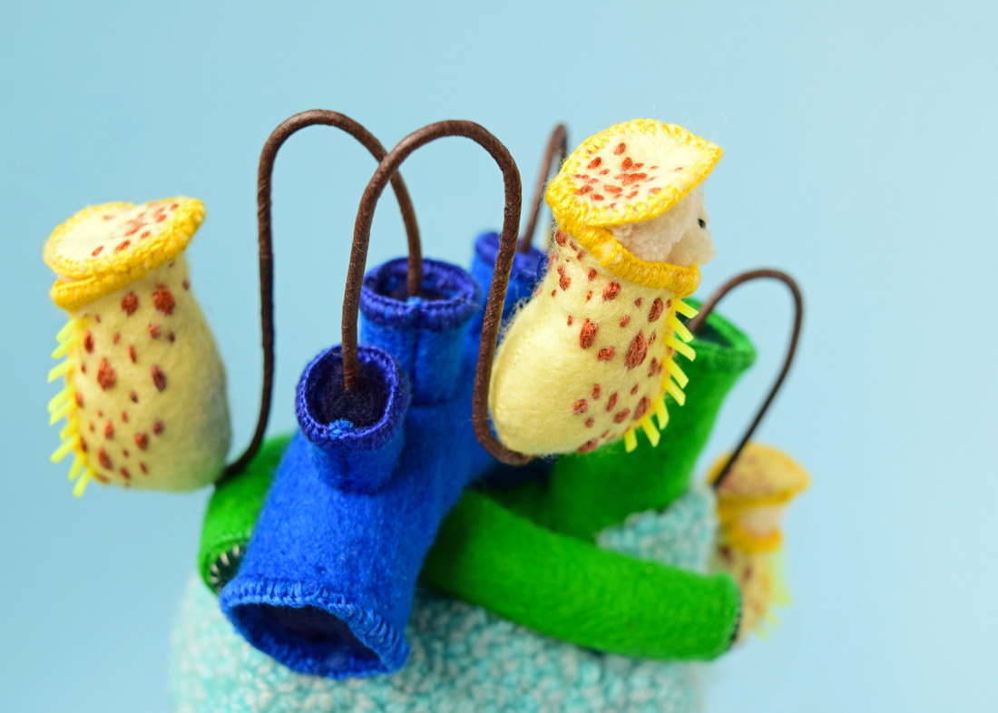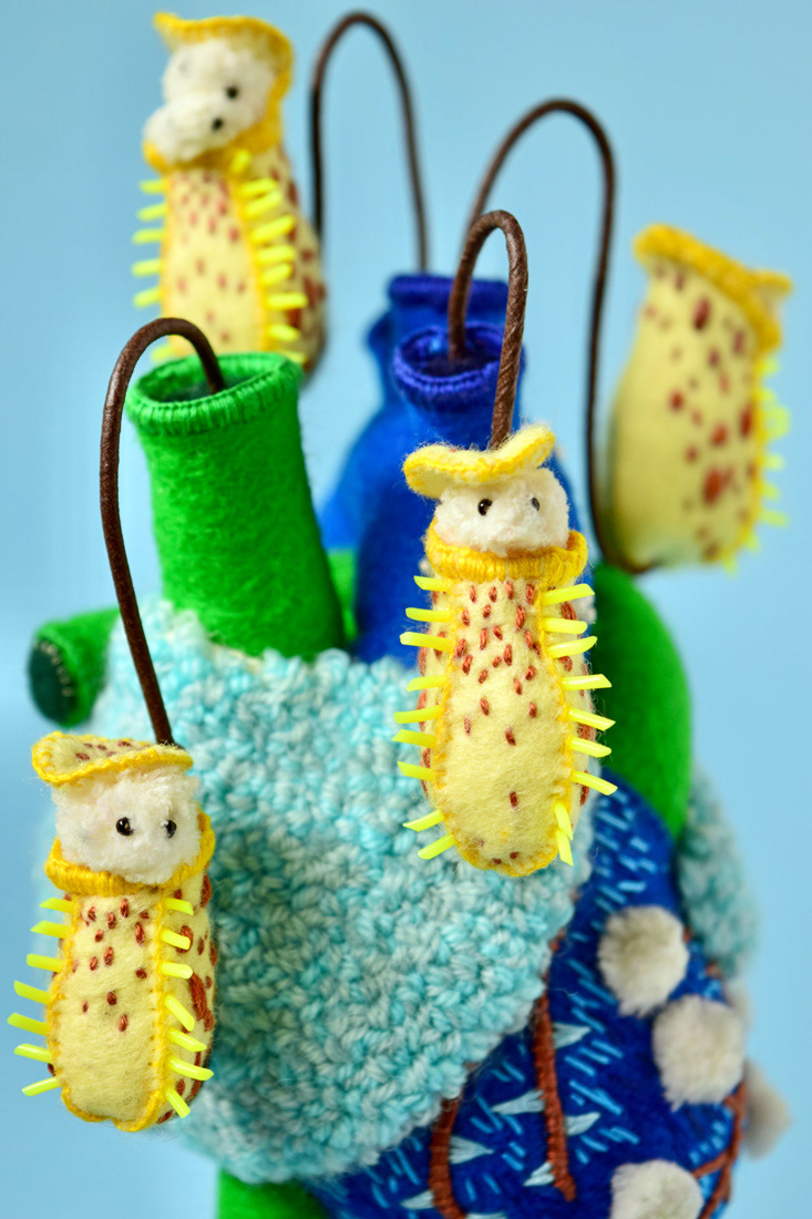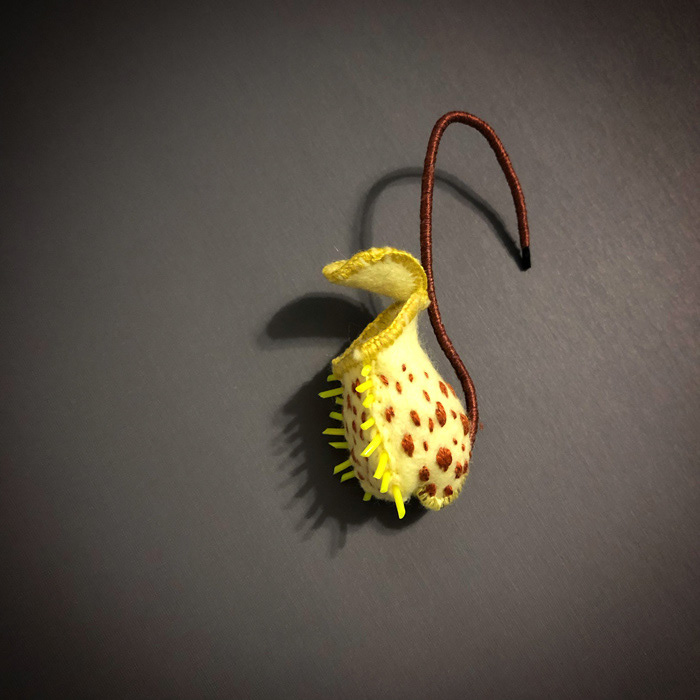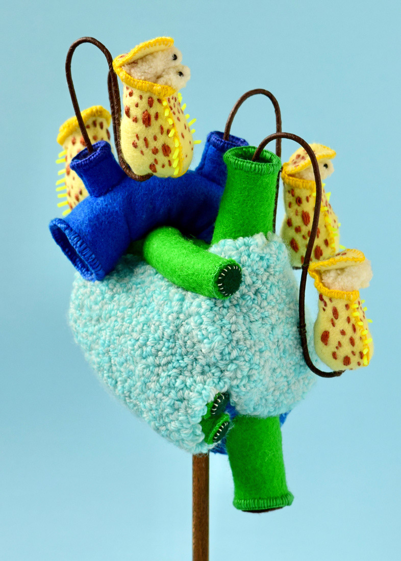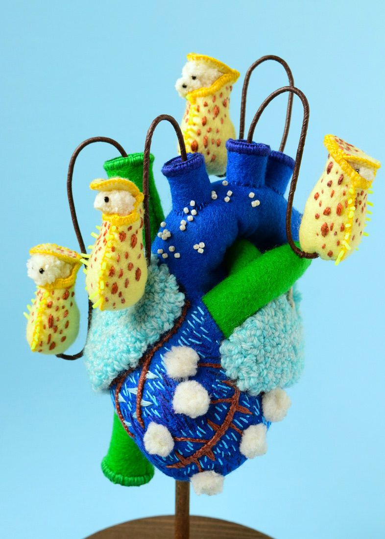 こちらは心臓解剖標本とネペンテスの標本ソフトスカルプチャー作品で、すべて手縫いでパンチニードル技法や刺繍を施しています。