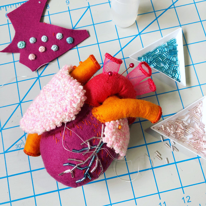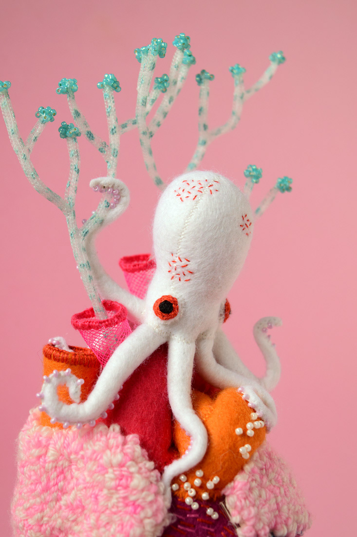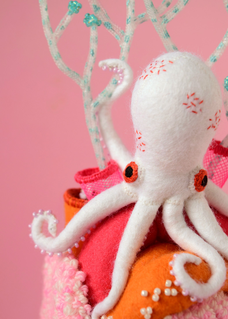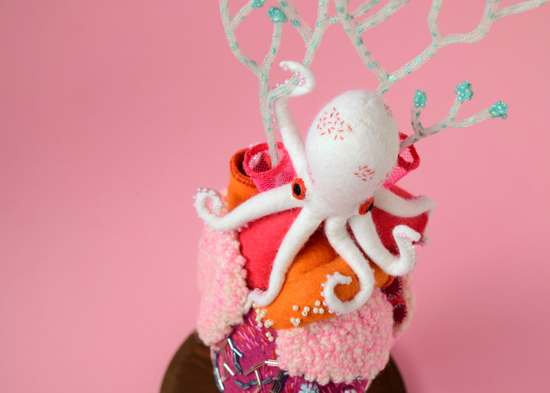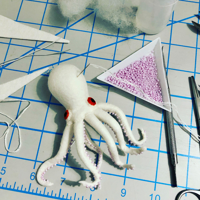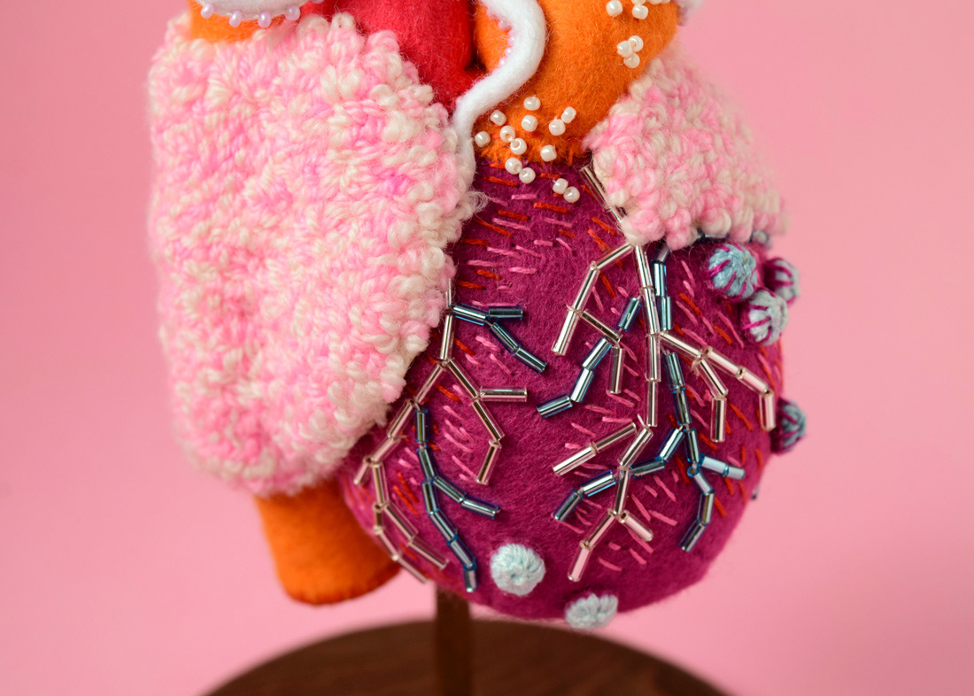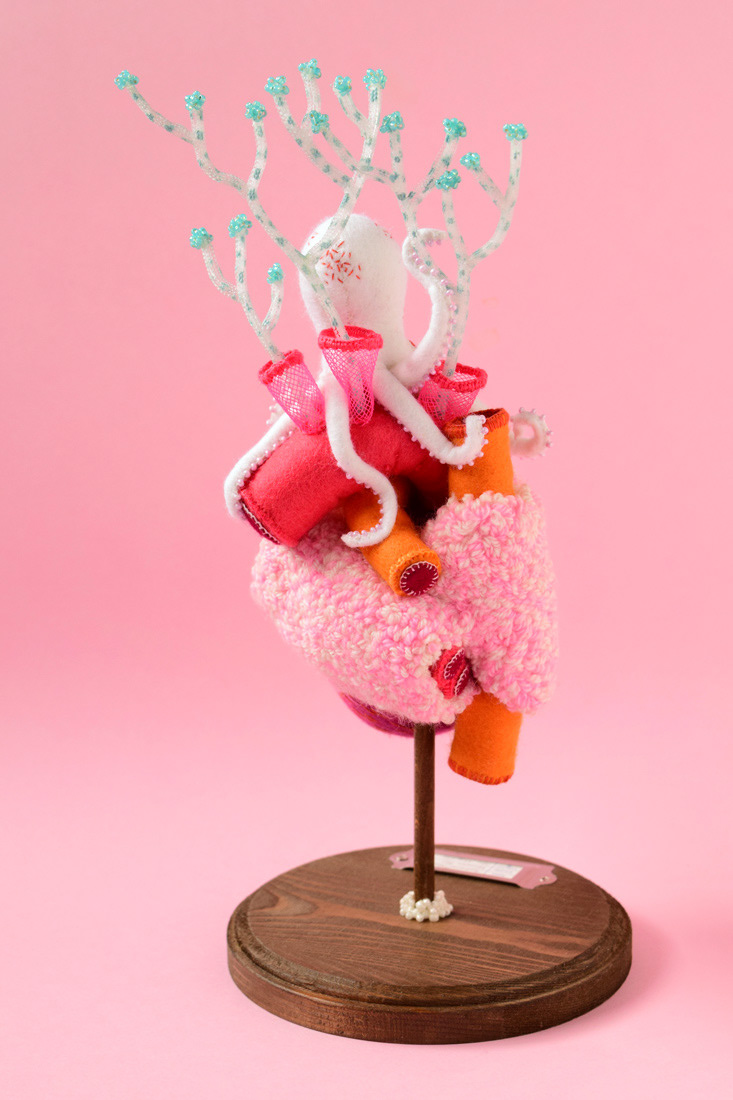 こちらは心臓解剖標本と蛸のソフトスカルプチャー作品で、すべて手縫いでパンチニードル技法や刺繍を施しています。