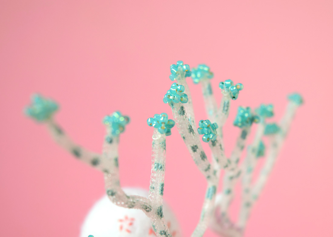 主な素材は、ウールフェルト、ウール毛糸、メッシュチューブ、ガラスビーズ などです。