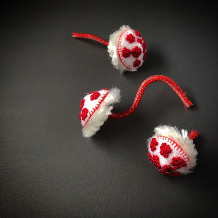 色々な素材(フェルト、毛糸、ビーズ、ワイヤー、メッシュチューブ等)を使用し手縫いとパンチニードル技法で製作しました。