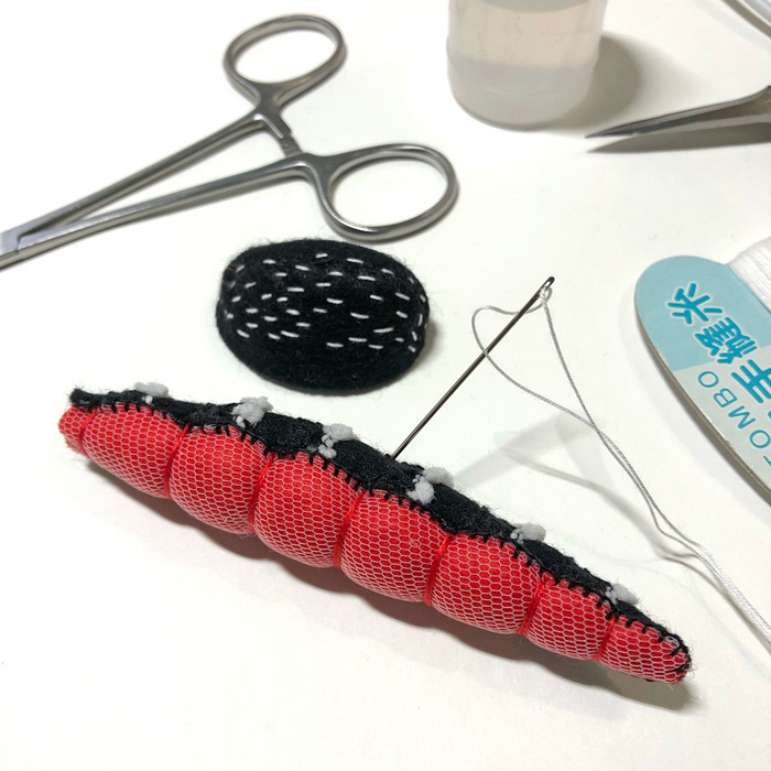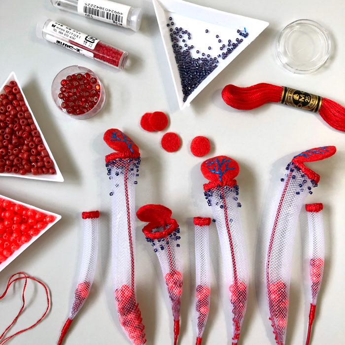 I used a variety of materials (felt, yarn, beads, wire, mesh tube, etc.), and made with hand-sewing, embroidery, and punch needle techniques.