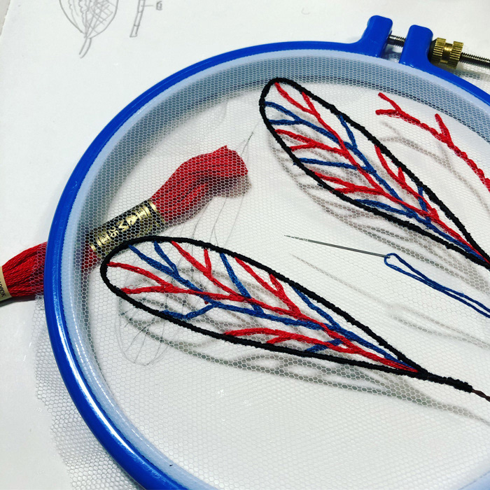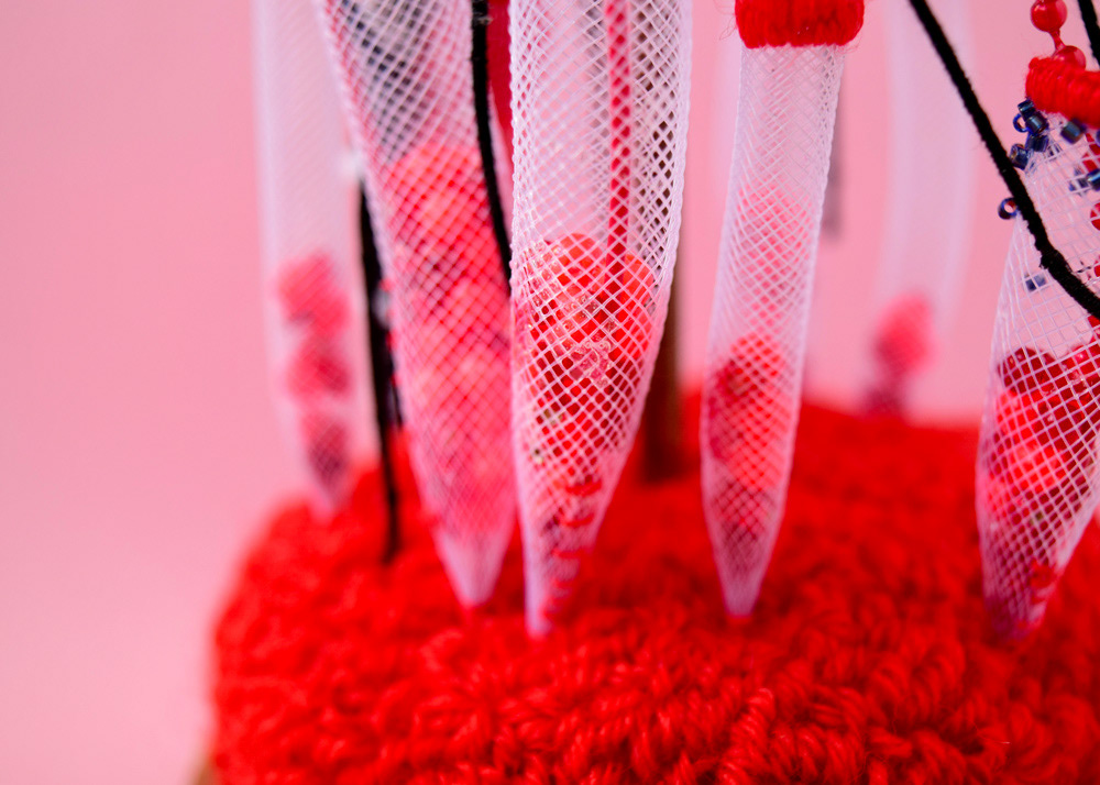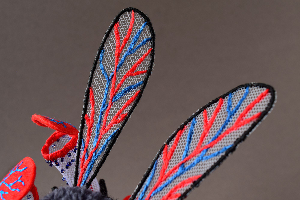 色々な素材(フェルト、毛糸、ビーズ、ワイヤー、メッシュチューブ等)を使用し、手縫いと刺繍とパンチニードル技法で製作しました。