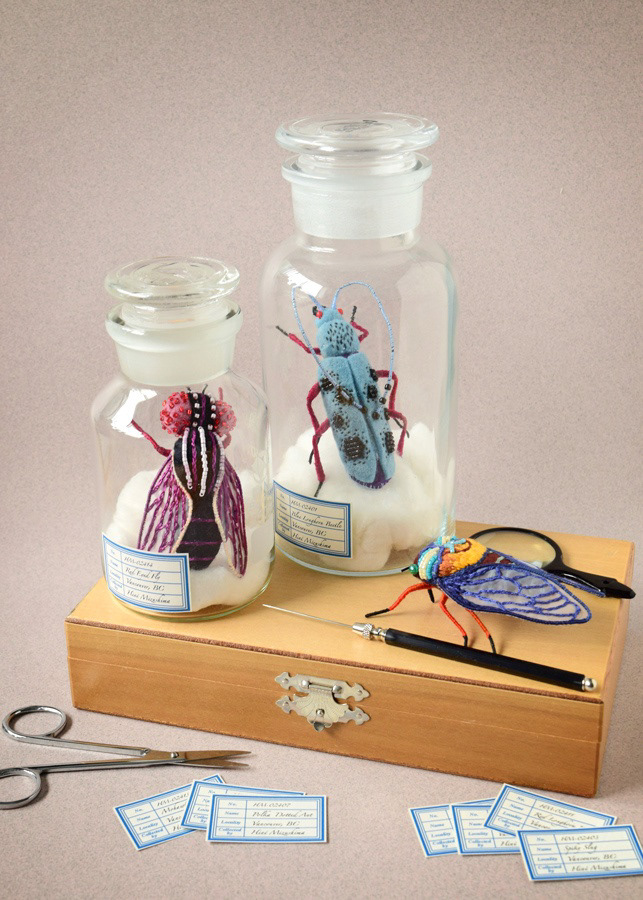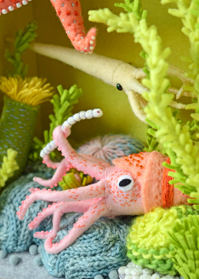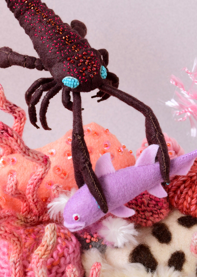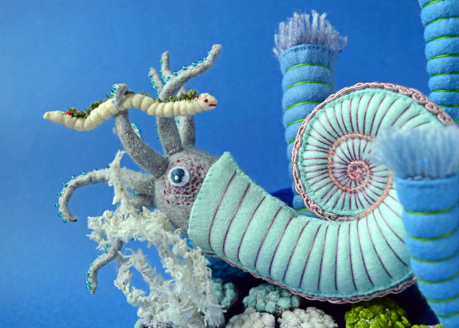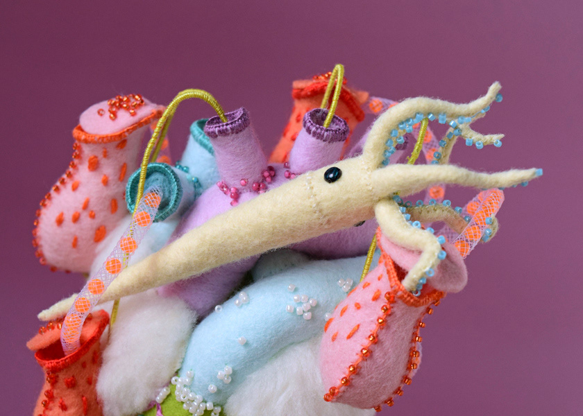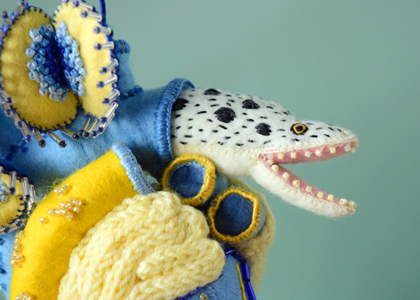 この展覧会では、古生代の海の生物、あまり強くないユニークな怪獣、風変わりな昆虫、そして心臓に住み着いた気まぐれな水棲生物や食虫植物などの不思議なクリーチャーたちを、ソフトスカルプチャー、刺繍、パンチニードル、ビーズワークなどの技法で生き生きと表現しました。