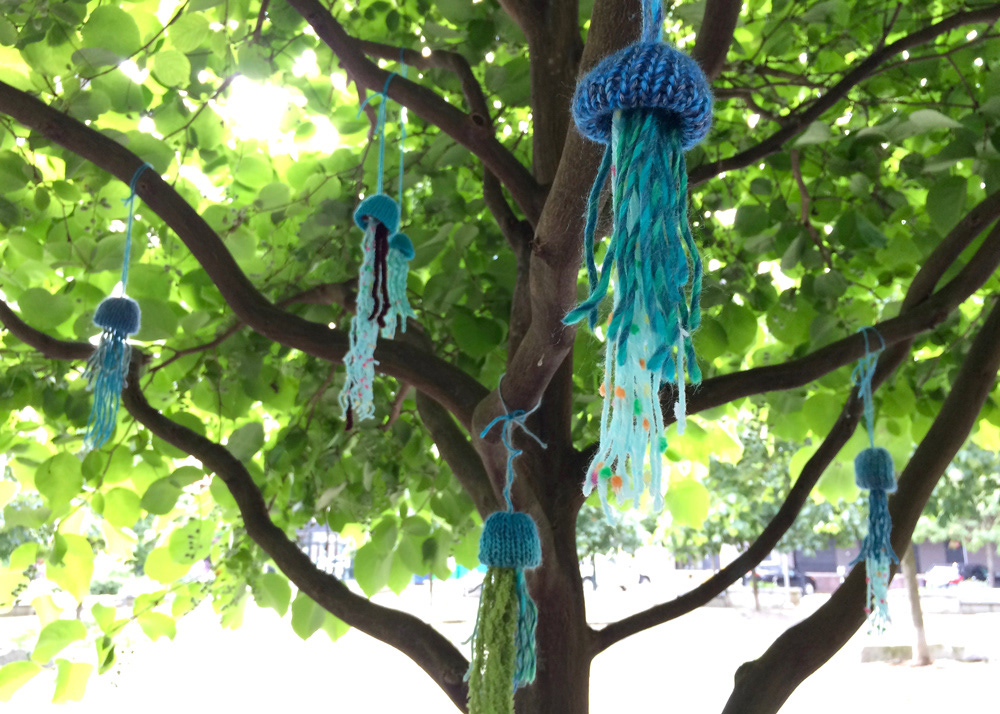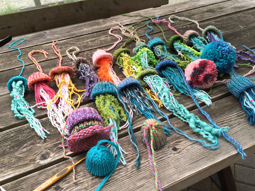 Outdoor knitting! We made more jellyfish & pompoms!