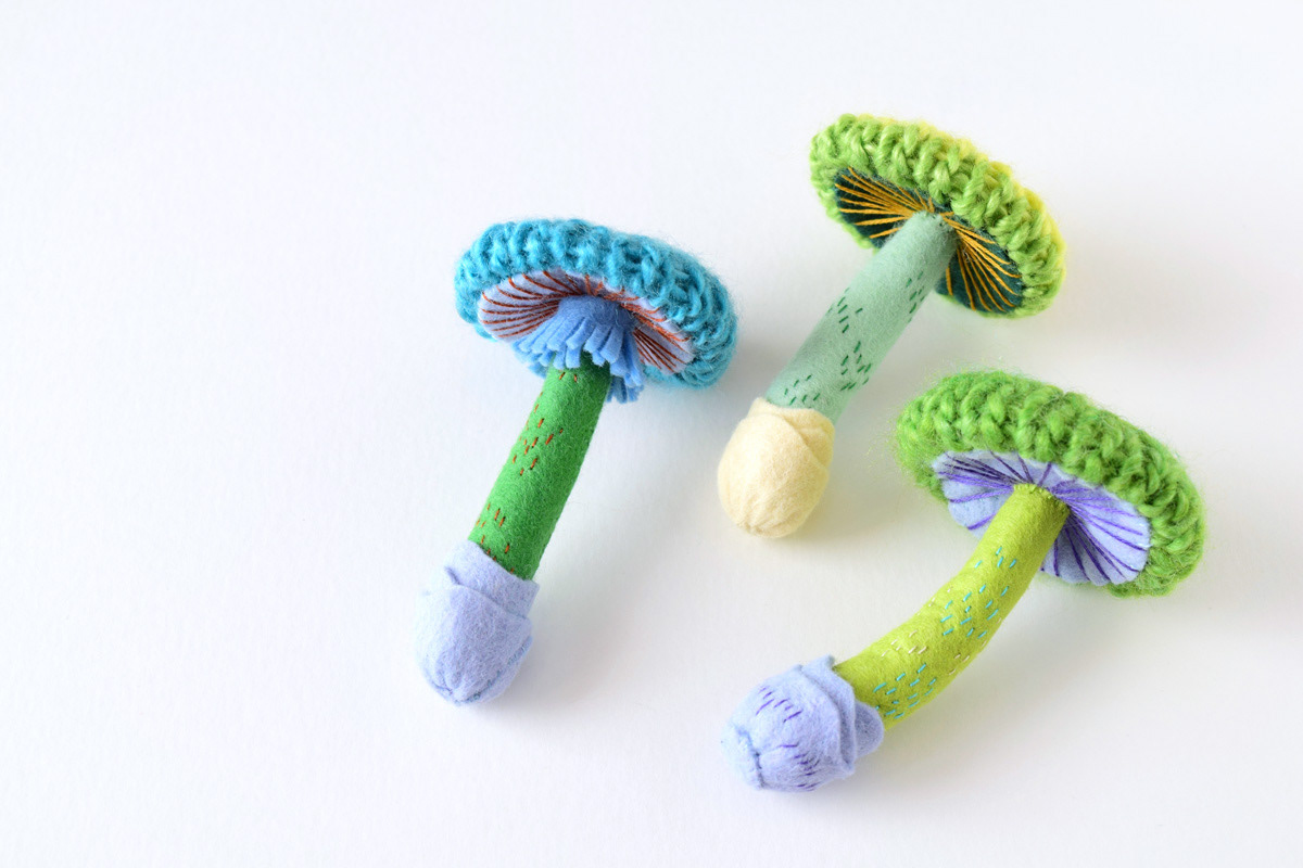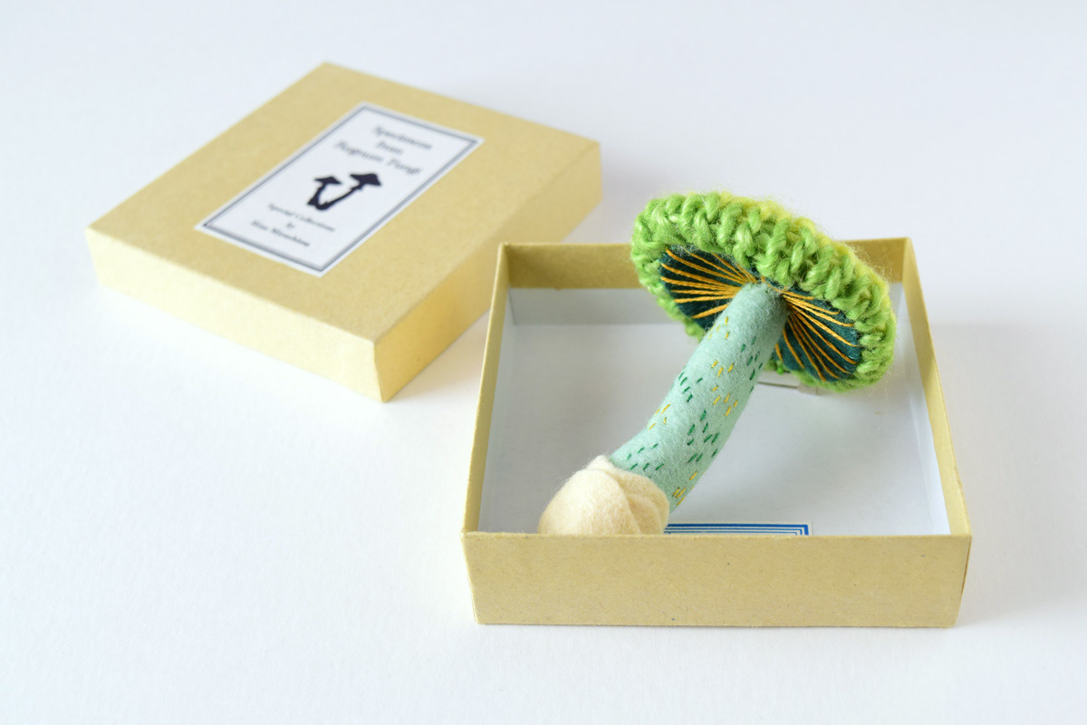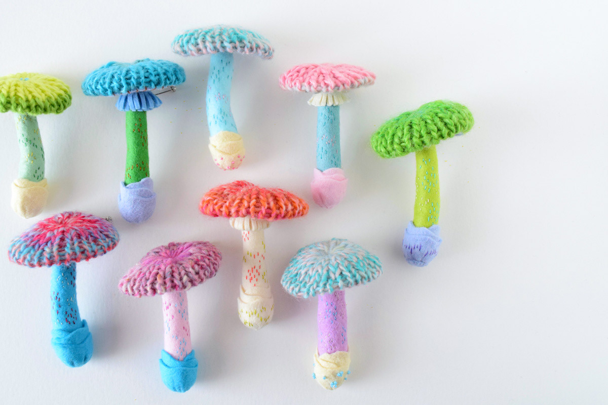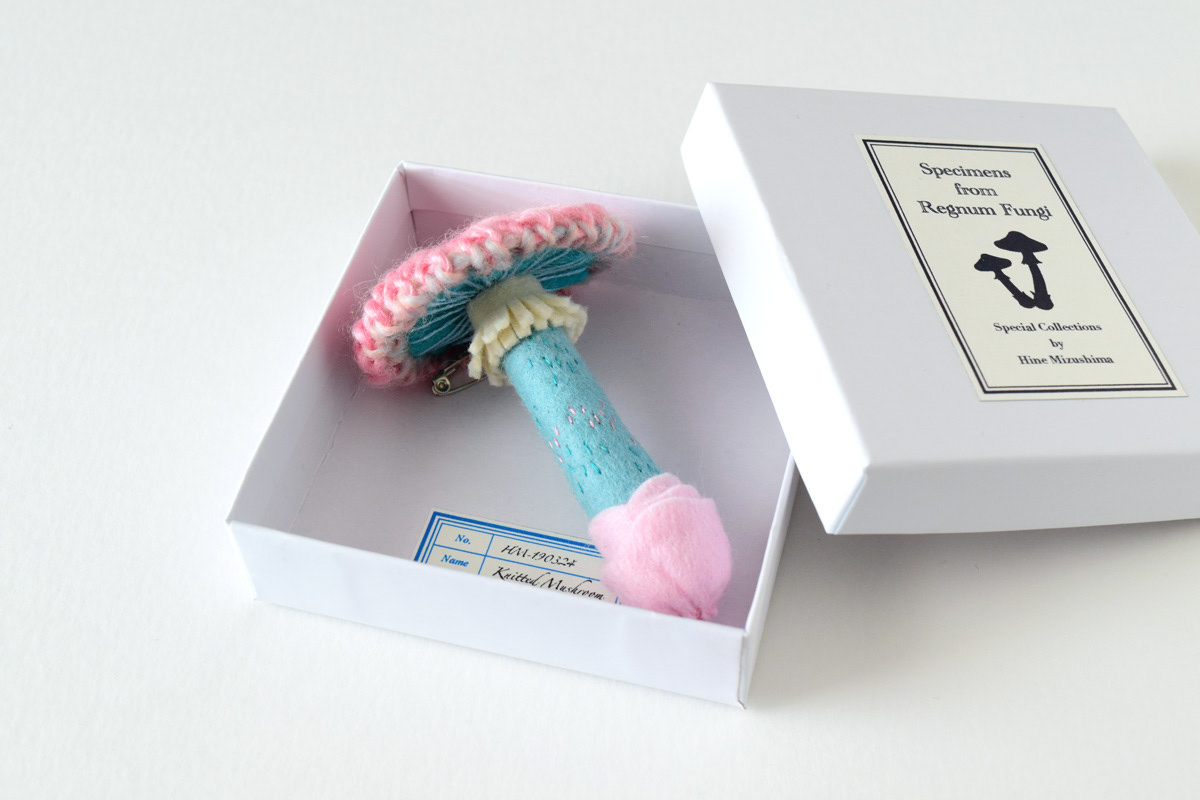 My new knitted mushroom brooches for a specimen themed exhibition at ranbu shop/gallery in Osaka, Japan.