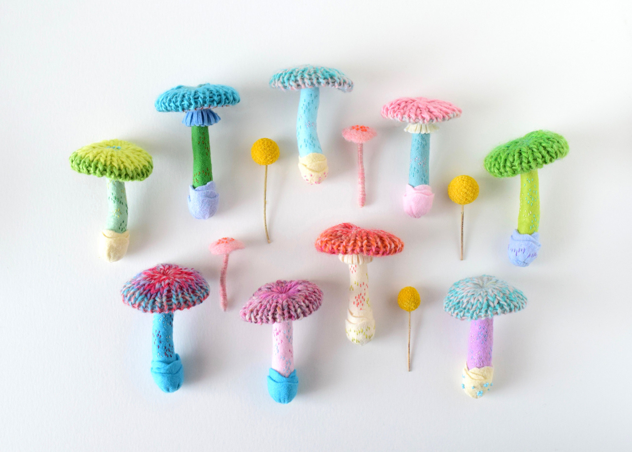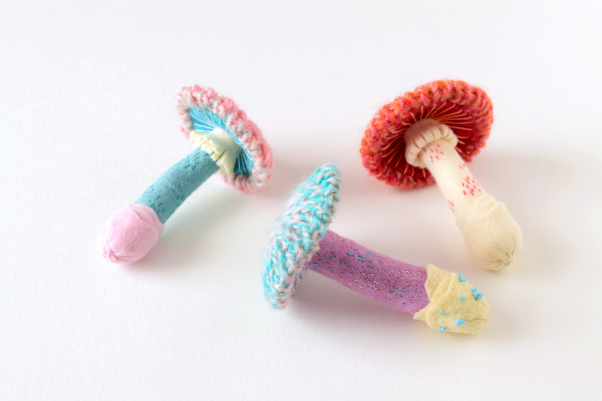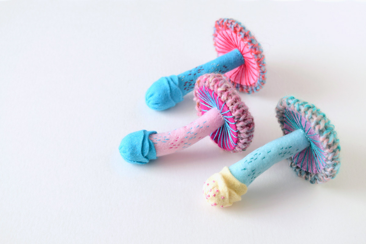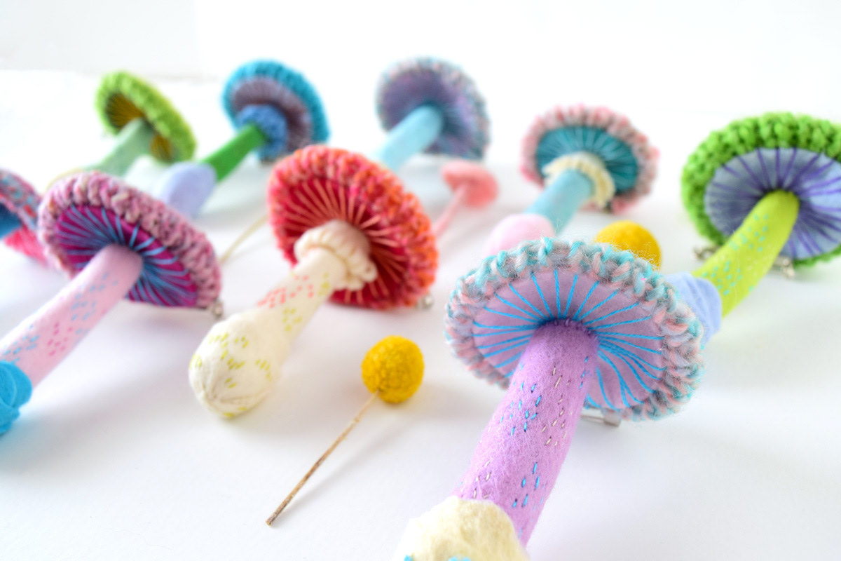 My new knitted mushroom brooches for a specimen themed exhibition at ranbu shop/gallery in Osaka, Japan.
