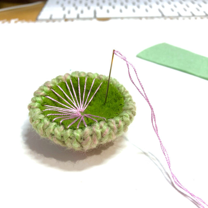 ranbu企画展「標本の王国 」出品中の編みキノコブローチ。