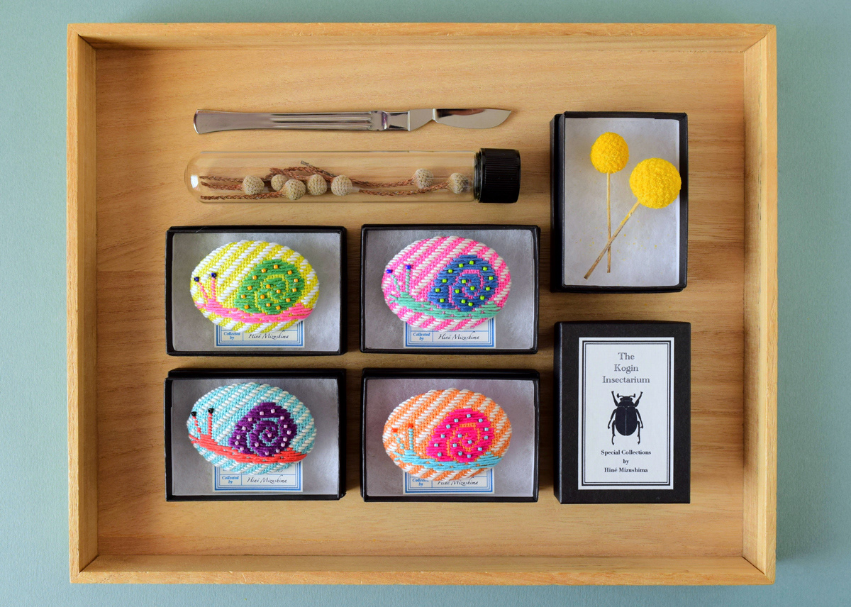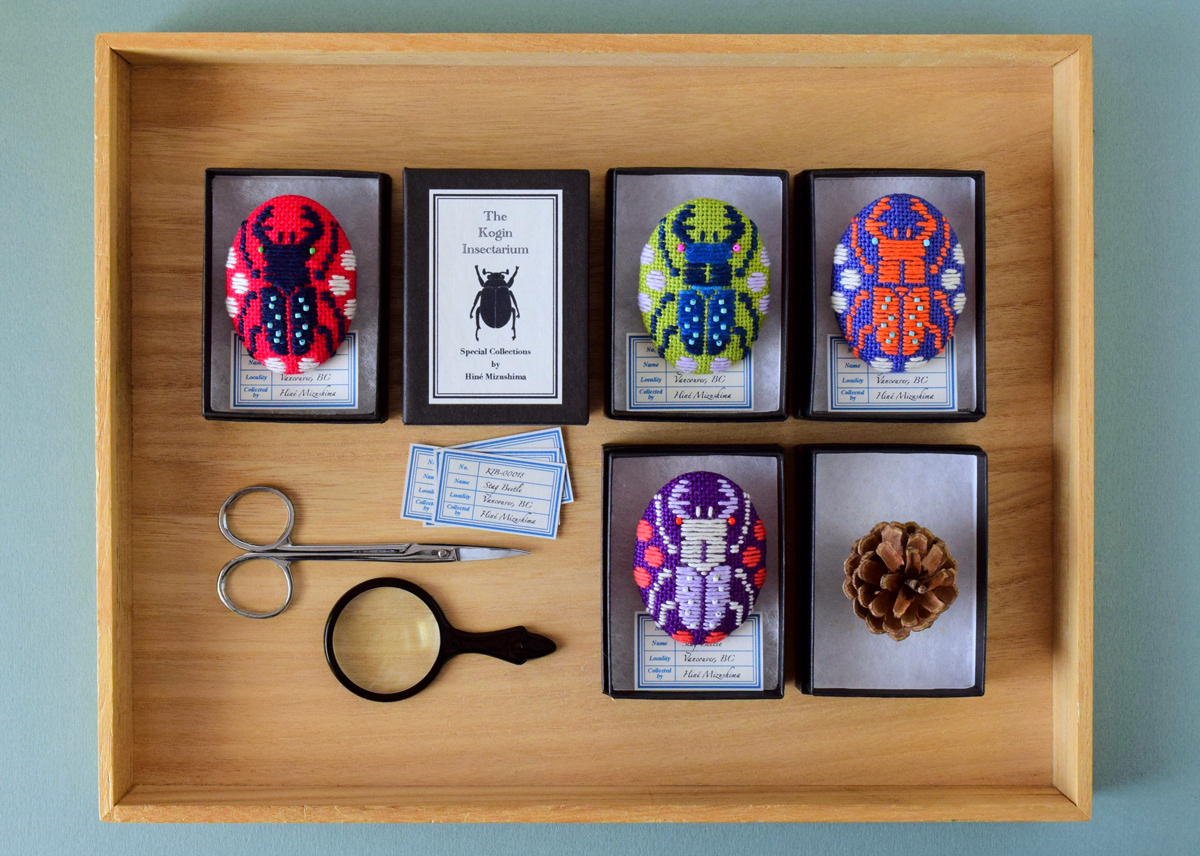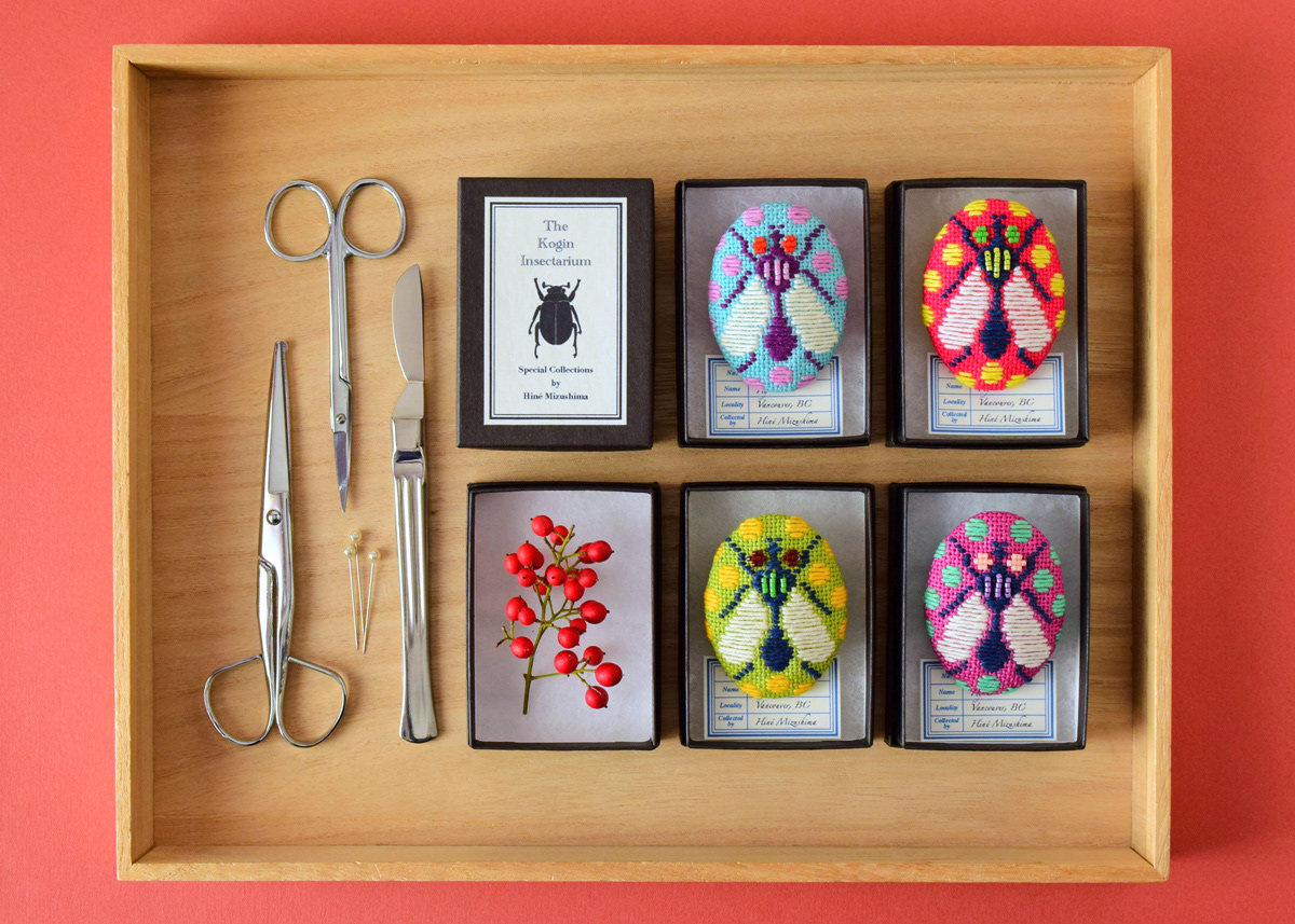 Kogin embroidered insect brooches for a group exhibition, The Kingdom of Specimens at ranbu gallery (2nd floor) in Osaka, Japan, opening June 20th, 2018!