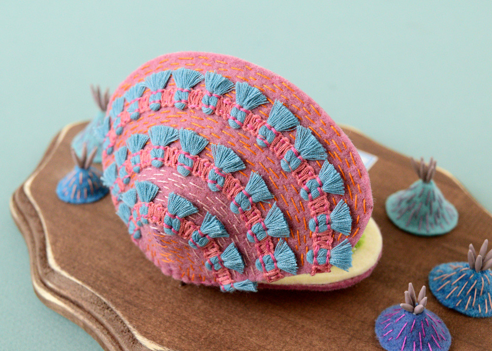 ソフトスカルプチュア系グループ展「Stitched 2」用の作品3点の内のひとつ「桃五目貝の解剖模型」(幅23cm)。